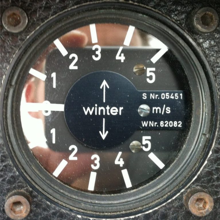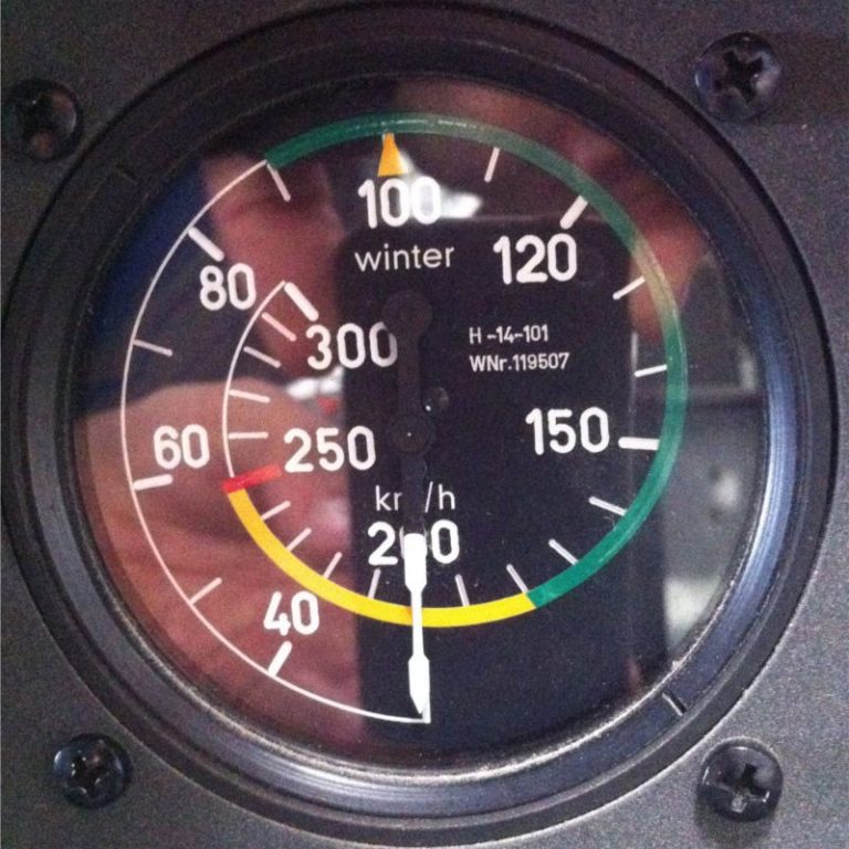 Misst die Geschwindigkeit gegenüber der anströmenden Luft und ist ein sehr wichtiges Instrument. Er zeigt in km/h an und hat Markierungen für Mindest- und Höchstgeschwindigkeit. Fällt er aus, fliegt der Segelflieger einfach nach Gehör und Gefühl, was auch ganz gut funktioniert.