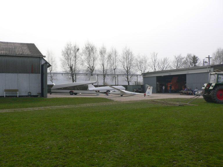 Einen Flugplatz macht nicht allein eine große Landebahn aus, sondern ebenso wichtig ist eine entsprechend trockene und sichere Unterstellmöglichkeit für die bei uns am Flugplatz ansässigen 9 Flugzeuge, welche mit einer Spannweite von bis zu 20m einen erheblichen Platzbedarf in Anspruch nehmen.